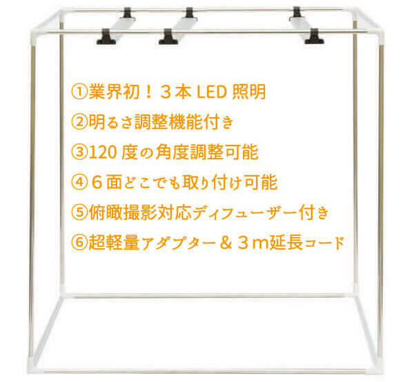 業界初の3本LEDが自由に取り付け可能。さらに明るさ調整機能によって、陰影を強調した高級感ある写真撮影が可能です。