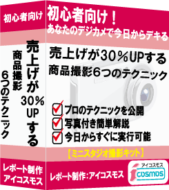 メルマガ登録後すぐに閲覧できます。売上げが30%UPする商品撮影6つのテクニックレポートの中の6つのうち1つだけ閲覧できます。 ※この6つのテクニックは、このページで紹介している無料メルマガ講座よりワンランク上の写真を撮るためのテクニック集です。 |