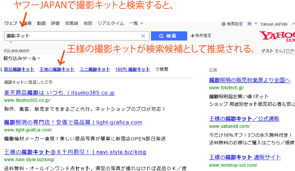 Yahooで「撮影キット」と検索すると、当店の【王様の撮影キット】が関連キーワードの候補として表示されます。