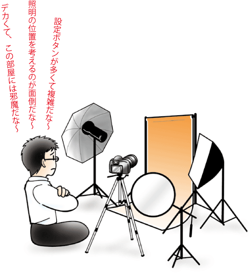 それもそのはず、本格的なプロ用の撮影キットは、そもそも十分なスペース(撮影用の小部屋)があることを想定して、大掛かりに設計されているからです。